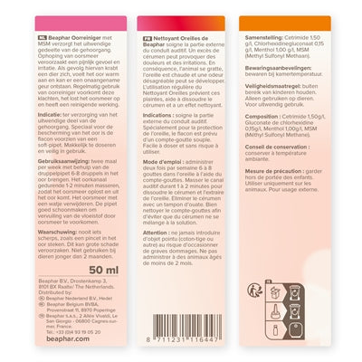 Beaphar oorreiniger met MSM verzorgt het uitwendige gedeelte van de gehoorgang. Ophoping van oorsmeer veroorzaakt een pijnlijk gevoel en irritatie. Als gevolg hiervan krabt een dier zich, voelt het oor warm aan en kan er een onaangename geur ontstaan. Regelmatig gebruik van oorreiniger voorkomt deze klachten, het lost het oorsmeer op en heeft een reinigende werking. Daarnaast helpt regelmatig gebruik om oormijt te voorkomen.