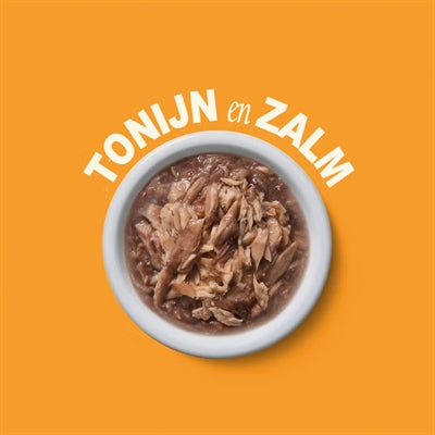 Vers bereide tonijn (47%), vers bereide zalm 4%, tonijnbouillon (47%), zonnebloemolie, mineralen, tapioca, tonijnolie.