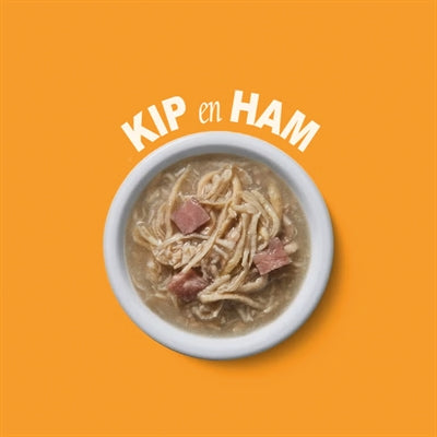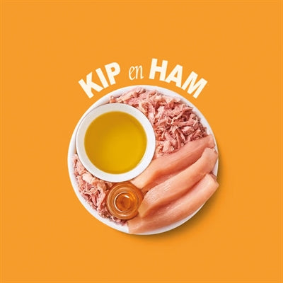 Vers bereide kip (45%), vers bereide ham (3%), kippenbouillon (47%), zonnebloemolie, mineralen, tapioca, tonijnolie.