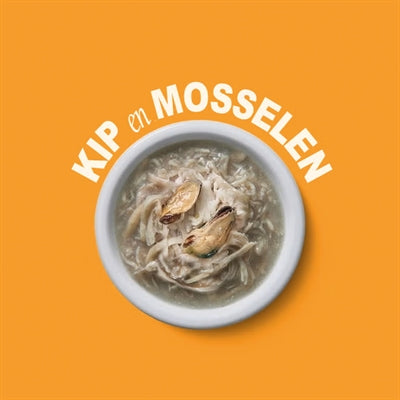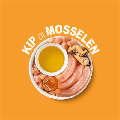 Vers bereide kip (45%), vers bereide mosselen 3%, kippenbouillon 47%, zonnebloemolie, mineralen, tapioca, tonijnolie.