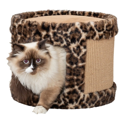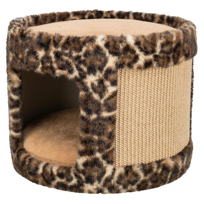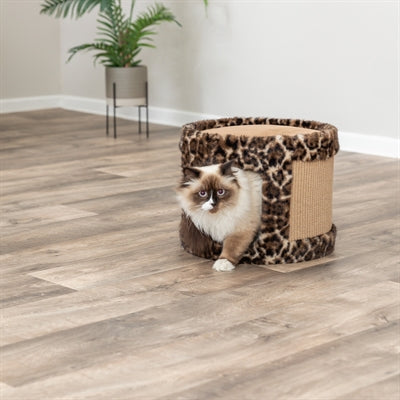 De Trixie Krabton Leo Panterprint Bruin is een luxe krabton waarin je kat heerlijk kan spelen, rusten en zich kan terugtrekken. De buitenzijde is bekleed met stijlvol panterprint pluche en voorzien van krabvlakken van jute, ideaal om aan te krabben. Binnenin bevindt zich een comfortabele schuilplaats met een zacht fleece interieur en een omkeerbaar kussen voor extra ligcomfort. Bovenop biedt een bekleed ligplateau een fijne uitkijkplek.
